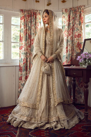 Description: An ivory tulle double layered pishwas, hand worked using dabka, zardozi and hand cut sitara.