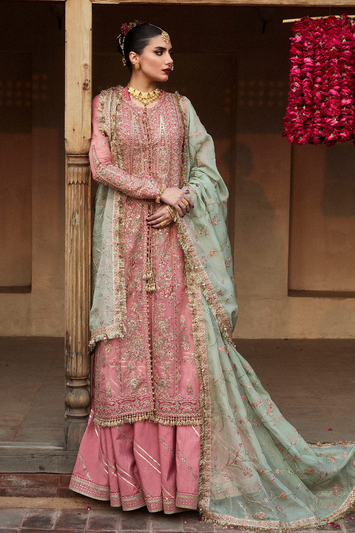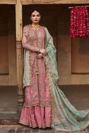 - Trouser: The outfit is paired with a Korean embroidered raw silk sharara, adding a unique and refined charm to the overall look.