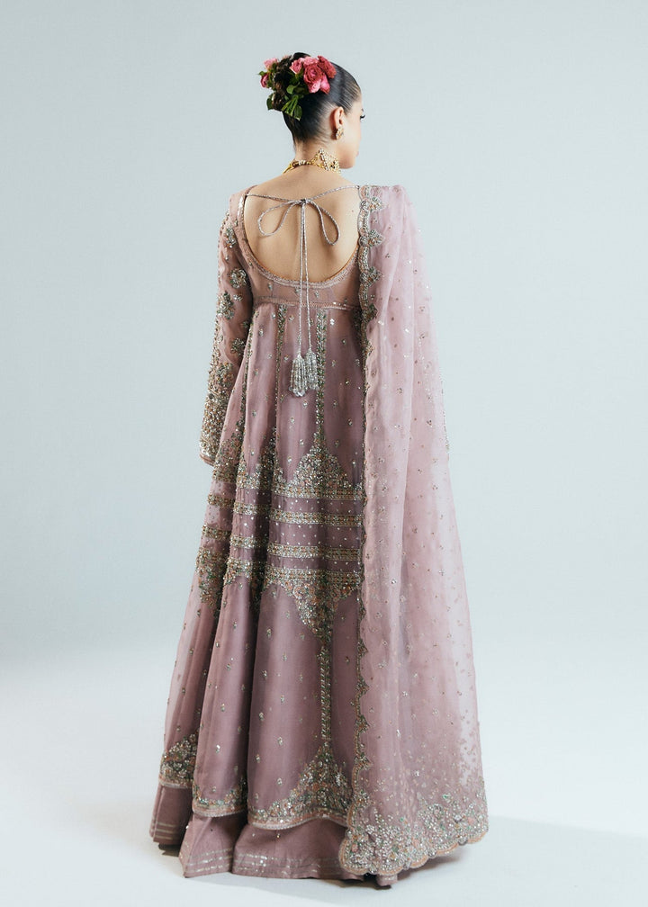Presenting the Lavender Majesty Ensemble, an ethereal blend of elegance and charm. This unstitched outfit features a luxurious lavender-pink organza jacket, lavishly embellished with intricate detailing on both front and back bodice and panels. The floral and celestial motifs are meticulously crafted with delicate sequins and beading, creating a captivating allure. The ensemble includes a flowing Korean raw silk lehenga that adds a regal touch, while the embellished organza dupatta with celestial accents completes this enchanting set.