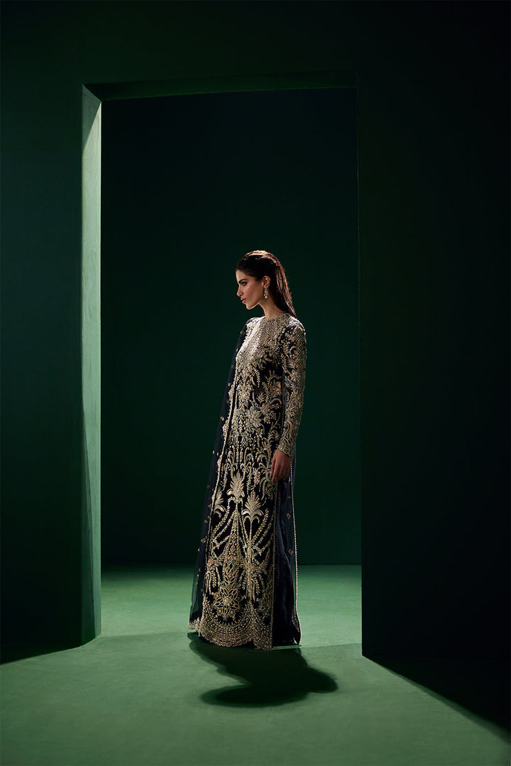 Éclat is a sleek black mock-neck net shirt, adorned with delicate chandi embellishments that gracefully flow across the front and back. It is paired with flared trousers featuring intricate scalloped cutwork, and a matching opulent dupatta.